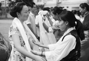 藏族學(xué)生向來自浙江的支教老師表達(dá)祝福。 王麗煒攝