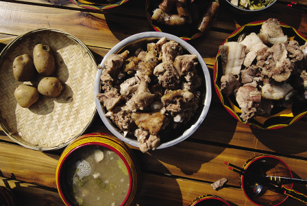 彝家人過(guò)年除了吃坨坨肉外,大多還要吃雞肉。這一天,家家桌上肉多多,素菜一般僅有一盆酸菜湯,這是解油去膩的美味。