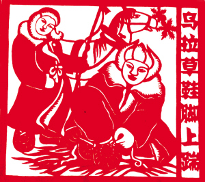 滿族風情剪紙《冰上釣魚單線拽》