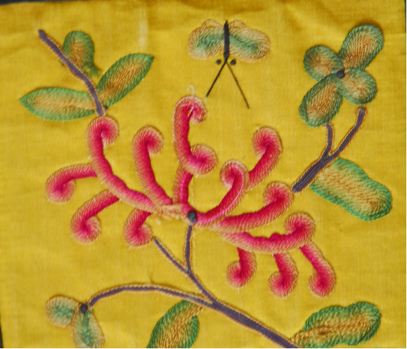 5.拽蜂,是在面料平底上繡制出立體的蝴蝶。由于繡工精細(xì),找不出怎樣連接繡制的地方,好像從布地子上拽出來的蜂,“拽蜂”之得名,古代稱蝴蝶為蜂。