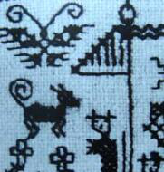 挑花(又叫十字挑花)是滿族民間刺繡中廣為流傳的一種針法。用交叉的十字組成抽象的圖案,粗獷簡潔,是人們?nèi)粘I钣闷分械闹饕b飾圖案,色彩比較單一,后來發(fā)展為復(fù)雜的十字繡。