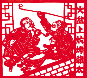滿族風(fēng)情剪紙《姑娘叼個(gè)大煙袋》