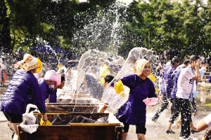 “扁水”是當(dāng)?shù)胤窖?,為戲水、潑水之意?!氨馑笨駳g節(jié)源于侗族“為也”習(xí)俗,為做客之意,指村寨之間村民們的互相訪問(wèn),是當(dāng)?shù)匾?guī)模最大的社交和娛樂(lè)活動(dòng)?!盀橐病睍r(shí),當(dāng)?shù)囟弊迦罕姂蛩?、潑水狂歡,久而久之就形成了“扁水”狂歡節(jié)。