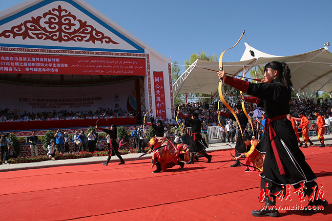 射箭是游牧民族在過去的游牧生活中必會的生存本領(lǐng)之一,哈薩克族的射箭也是傳統(tǒng)的體育競技項(xiàng)目。圖為阿克塞之鷹2017年絲綢之路騎射國際大學(xué)生邀請賽上,學(xué)生的射箭展示
