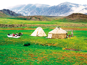 氈房外觀通常樸實(shí)無華,門框由松木做成,上面雕刻花紋或繪制圖案,一塊鮮艷奪目的掛毯吊在門上。房內(nèi)富麗堂皇,布置合理,前半部分堆放日用物品,后半部分待客、住人。