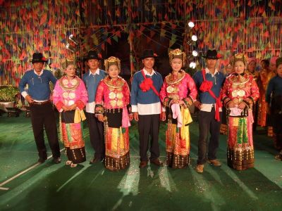 主婚人念完祝詞以后,新郎、新娘各在桌上揪下一團(tuán)糯米飯,蘸點(diǎn)米酒、食鹽、舂鹽捧、芭蕉后擺在桌前。主婚人拿起一條長長的白線,從左至右纏在新娘、新郎的肩背,將白線兩端搭在“茂歡”之上,表示將一對新人的心拴在一起。然后再拿兩縷白線,分別纏在新郎、新娘的手腕上,祝愿新婚夫婦百年好合,無災(zāi)無難。在座的長者也各拿兩縷白線,分別拴在新郎、新娘手上,邊拴線,邊念些祝愿詞。拴完線后,婚儀基本結(jié)束,婚宴開始,新郎新娘向賓客敬酒致意。