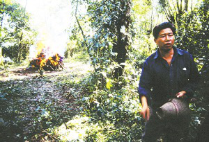 進入墓葬地,茂盛的野草,蔽日的樹林,不時進入眼簾的墳堆,還有一伸一縮往人腳上爬的螞蟥,讓人毛骨悚然。來到一塊剛砍過的開闊地,中央挖了一個坑,里面滿是倒插著的樹柴,柴堆上還放著兩個舊汽車輪胎。巖化告訴我說:“一次火葬需要兩拖拉機柴,如果死者家里沒有柴,我們就會每家湊一兩根,直到湊夠為止。用車輪胎是為了更好的燃燒。”人們把棺材停放在柴堆的左側,將“恒叫”取下,巖約將棺材蓋板掀開,用從家里帶來的一個竹筒里的水朝死者臉上倒。巖約告訴我:“這是給死者洗臉,幫她打扮一下。”然后,大佛爺開始念經,經文的大意是:“山上的神啊,我們的親人到這里居住,你們要好好服侍她,把周圍看管好!邪惡的鬼啊,這里是我們親人應有的地盤,你們不得侵犯,你們不要來擾亂!”念完,就一個人先走了。然后,人們雙手合掌,掌中緊握一根蠟條,圍著轉了三圈,婦女們也先走了。邊走還邊相互告誡,不要回頭看,不然死人的鬼魂會跟著你走。剩下的男人將棺材抬上柴堆,將用白布裹著的死者,頭朝寨子,腳朝外,意思是你已從寨子出來了,以后再也不準回寨子了。用柴壓著,又把棺材砸碎,將棺材碎片也堆放上去,有人就拿來一個塑料桶,開始往上潑澆柴油,并從寨子的這方先點火。一會兒,熊熊的大火便燃燒起來。有人拿著用礦泉水瓶子裝著的酒給大家倒,輪流喝。喝過一圈后,他們摘下一枝樹枝,往自己的衣襟前后拍打一陣,將樹枝扔進火里。巖化說:我們要走了,這樣做是把身上的鬼氣趕盡。我也敢緊學著他們的樣子做了一通,便隨人們離去。