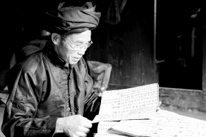 貴州省榕江縣水尾水族鄉(xiāng)水盆村地處月亮山深處,與外界接觸少。目前,該村村民仍穿水族服裝,講水族語(yǔ)言。該村有169戶共796人,水書先生有10人。他們保存水書1000余冊(cè),其中, 有成書50年以上的水書300余冊(cè)。圖為水書先生王明先在向人們展示水書。