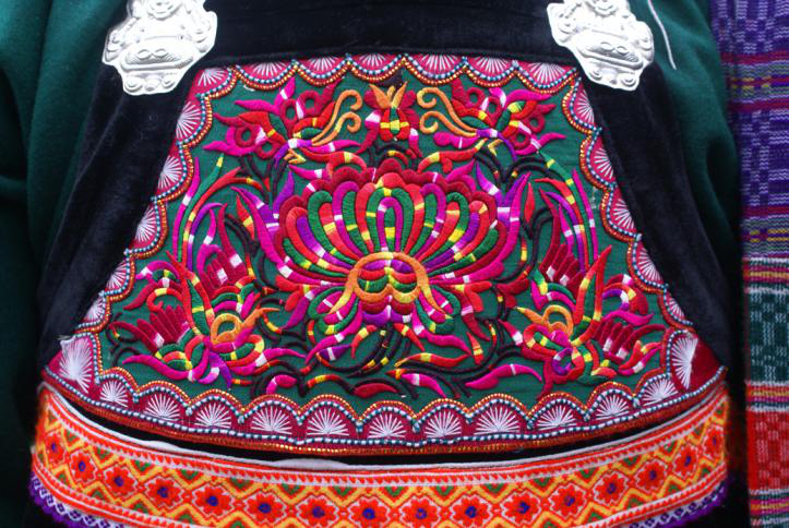 水族有養(yǎng)馬賽馬習(xí)俗,馬尾繡應(yīng)運(yùn)而生。以絲線裹馬尾刺繡制作圖案的好處是馬尾質(zhì)地較硬,能使圖案不易變形,馬尾不易腐敗變質(zhì),經(jīng)久耐用;還有馬尾上含有油脂成分,利于保養(yǎng)外圍絲線光澤;另一奇特之處就是繡品上綴有形如古代錢幣的銅飾,以紅線穿貼于馬尾繡片里,如星星點(diǎn)點(diǎn)的小花,除了做裝飾外,水族同胞認(rèn)為,銅有驅(qū)邪避兇的功能。在封建社會(huì),銅是鑄幣之物,一些朝代嚴(yán)禁民間鑄銅,馬尾繡里卻繡有銅飾,這充分體現(xiàn)了水族馬尾繡的珍貴文化藝術(shù)價(jià)值。