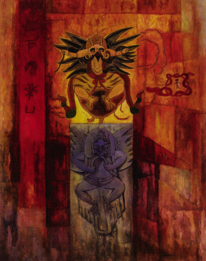 記者:你這次展出的作品都是以比較抽象的手法在表現(xiàn)東巴文化,以后在題材和手法上會(huì)不會(huì)有一些轉(zhuǎn)變?