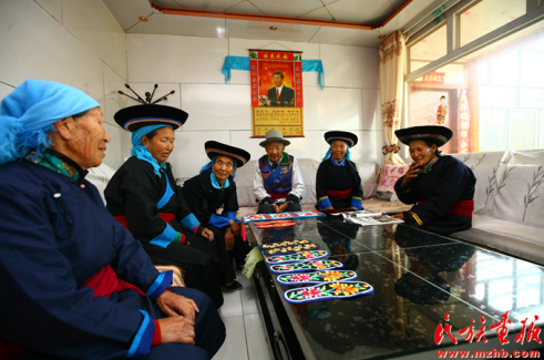 東溝村大莊村老年協(xié)會的土族老人們在交流刺繡技藝 引自民族畫報