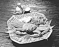 撒嘎當,即螃蟹剁生。以新鮮螃蟹為主要原料,配以糊辣椒粉、姜末、蒜泥、芫荽、南瓜籽、炒米面等佐料調(diào)制。加工時,將螃蟹敲死放在火塘中翻燒至熟,去掉硬殼后剁細成泥狀,加適量食鹽、糊辣椒末、蒜泥、熟南瓜子面、炒米面調(diào)拌均勻即成。這道菜味香、辣、鮮,用糯米飯蘸吃,或用蘿卜、白菜、水薄荷、野芹菜等蘸吃均可。