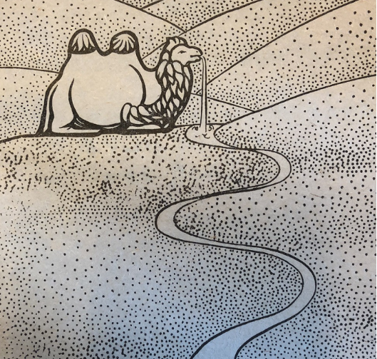 高興之際,大家想起了馱經(jīng)馱水土的駱駝;但是人們四下里一看,白駱駝不見了。真是,為了找水喝竟把勞苦功高的駱駝丟失了!大家找呀,找呀,找了一夜還沒找到,天亮?xí)r,又回到燒茶的地方,然后順水而上,繼續(xù)尋找。走不多遠,發(fā)現(xiàn)駱駝在前面靜靜地臥著,人們高興極了,有一個人三步兩步跑上去拉駱駝,可是駱駝一動也不動。眾人上前詳細一看,白駱駝已變成了石頭。那石駱駝在水里臥著,一股清水從它的嘴里噴出來,散發(fā)看清香的氣味,流向遠方。