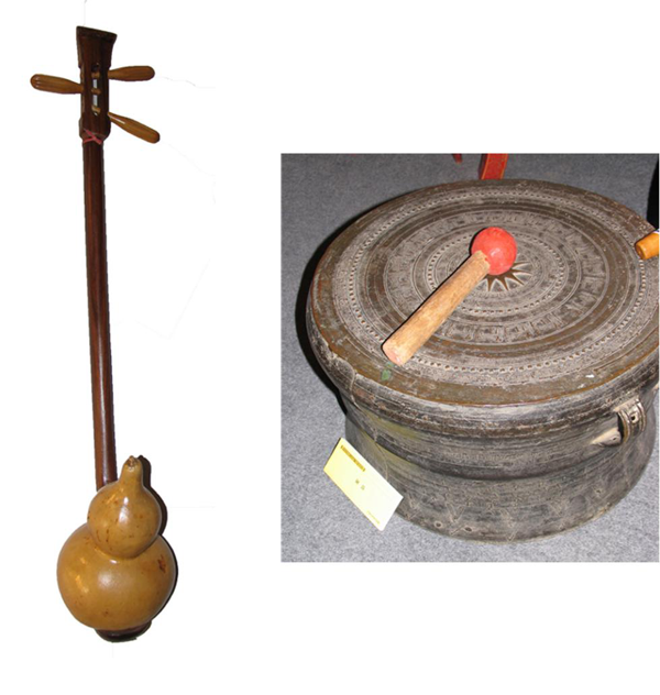 毛南族的歌舞比較簡單,樂器也不多,主要伴奏樂器有長鼓(也叫黃泥鼓、祥鼓)、木鼓、手鼓、铓鑼、小銅鑼,另外有時還用到鈸、木魚和碰鈴,古時還用嗩吶、簫、笛等(左圖為毛南族葫蘆琴)。