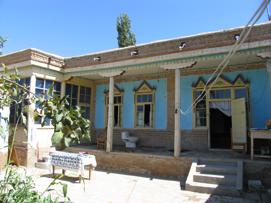 土房的墻一般都很厚,里面粉刷石灰,有的還掛壁毯。墻壁多用石灰刷成淡藍色,安雙層玻璃窗,內層為活動式,夏天可以取下,窗外有木屜子,起保護作用。窗戶上還開有小孔,以便通風。房內的地面為水泥或磚面。室內除有的搭火炕外,其它的裝飾和木房的一樣。不論哪個房間,都可作為臥室,也用于待客,廚房和儲藏室單建,有的還單建馕坑。