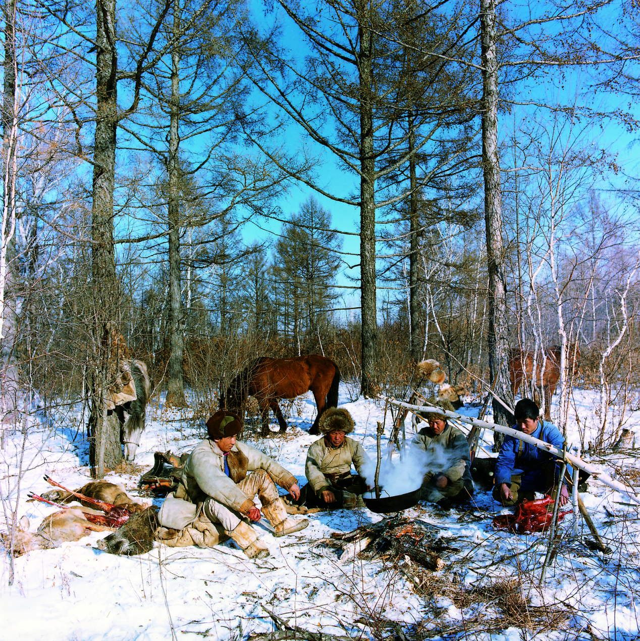 “烏勒倫”(煮肉,即手抓肉)、“達拉嘎蘭”,(燒肉)、“席拉蘭”(烤肉)、“枯胡熱”(熟肉干)、“烏爾嘎塔”(生肉干)是主要食用方法。他們一直保留著食生習慣,所謂食生,主要是指狍子的腎臟(俗稱腰子)和肝臟,據(jù)說狍腰子可以補腎強身,狍肝可以清火明目?!鞍⑺亍笔菍⒅笫斓尼箢^肉、心肺、里脊切成細絲或小丁塊,拌上野豬油、熟狍腦和野蔥花、鹽等佐料,看上去像西餐中的“沙拉”,可以直接食用,也可以回鍋炒一下再吃?!安加蜕?,即血腸,讓大型動物的膛血沉淀后將白色的血清和紅色的血液分離,加佐料分別灌入兩根腸衣中,煮熟后紅白分明,味道亦各具特色。