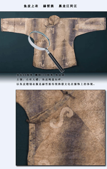 赫哲族的魚皮衣歷史久遠。我國古代文獻《山海經(jīng)》第九卷《海外東經(jīng)》中便有“玄股之國,在其(黑齒)北,其為人衣魚食鷗” 的記載。“衣魚”西晉學者郭璞解釋為“以魚皮為衣也?!闭f明早在兩千多年前,赫哲族的先民就已使用魚皮做衣服了。另據(jù)密山新開流新石器時代遺址中出土的魚叉及骨針,證明赫哲族的先民捕魚和縫制魚皮衣有數(shù)千年歷史了。清代張晉彥的《寧古塔山水記》有:“魚皮部落,食魚為生,不種五谷,以魚皮為衣,暖如牛皮”的記載?!痘是迓氊晥D》記載:“赫哲衣服多用魚皮而緣以色布,邊綴銅鈴,亦與鎧甲相似。”另外,地方志書對此也多有記載??梢姡照茏逯谱骱痛┲~皮衣是真實而久遠的。