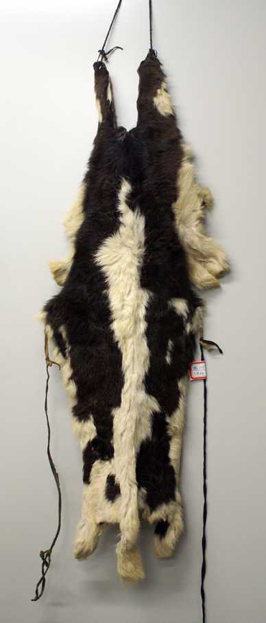 門隅南部地區(qū)的門巴族婦女,不分老少,袍服外披一張較為完整的小牛犢皮或巖羊皮,毛朝內(nèi)、皮板朝外,牛皮頸部朝上,尾部朝下,略做加工、而且四肢皮伸向兩側(cè)。以此為美飾,吉慶節(jié)日或訪親會友,都要披一張新牛皮做盛裝。傳說,唐代文成公主進藏時背上披著皮子以避邪,后來此物賜給門隅婦女,后此物就成為門巴族婦女歷來沿用的裝束。