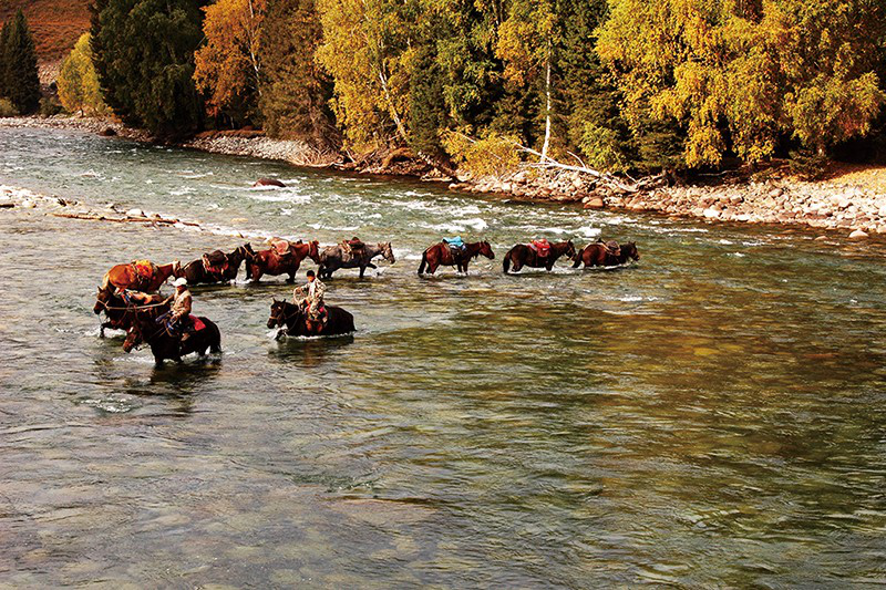 這時(shí)候,一位哈薩克族牧民騎著馬一邊往這邊走,一邊唱著歌??諘绲囊雇硪?yàn)橥蝗挥辛怂母杪?,一下子便被打破了寧?kù)o和孤獨(dú)。他走到我跟前,從馬上跳下來(lái),愣愣地望著月光中的阿克哈巴河。我覺(jué)得他有點(diǎn)奇怪,怎么突然瞅著阿克哈巴河就發(fā)起了呆。過(guò)了一會(huì)兒,他表情復(fù)雜地看了我一下,然后轉(zhuǎn)過(guò)身去,準(zhǔn)備牽馬離去。
