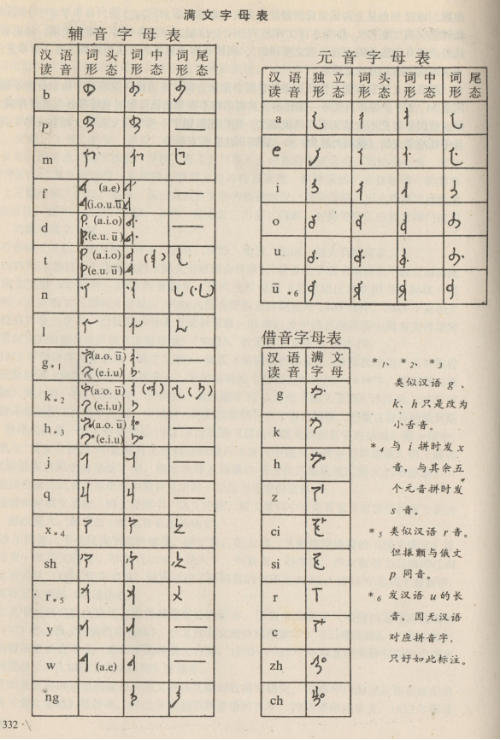 滿文字母有元音6個、輔音字母19個,借音字母10個。