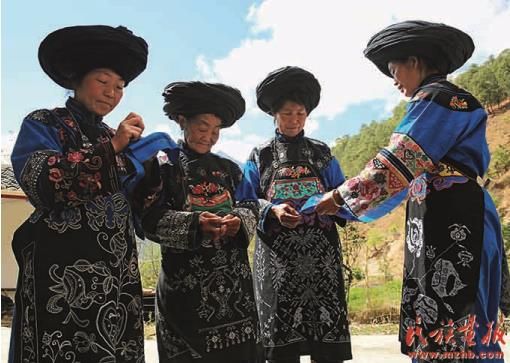 青海土族、四川羌族、云南彝族偏愛紅色服飾。在云南省楚雄彝族自治州永仁縣的彝族賽裝節(jié)上,婦女們身著紅色刺繡服裝,匯聚成一片紅色的“海洋”;涼山彝族以紅黃黑三色為主色,服飾、漆器、室內(nèi)外裝飾多為這3種顏色;漢藏語系彝語支的彝族、納西族、傈僳族、阿昌族等民族崇尚黑色,在他們的文化中,山水、地名、人名等都能體現(xiàn)尚黑的心理特點(diǎn);白族男女則崇尚白色,在其風(fēng)俗中,白色最為尊貴。