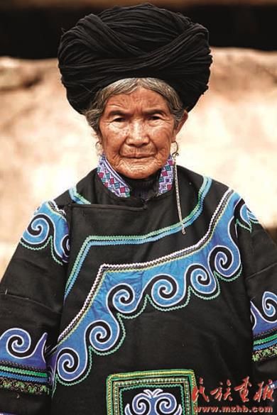 四川省涼山彝族自治州彝族老年婦女纏黑色頭帕。