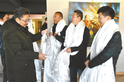 拉薩市文聯(lián)、拉薩市美術(shù)家協(xié)會(huì)的會(huì)員們向索曼尼(右二)等藝術(shù)家獻(xiàn)哈達(dá),慶祝2018年拉薩市美術(shù)家協(xié)會(huì)索曼尼、張德才和次格等藝術(shù)家的作品畫展成功舉辦。