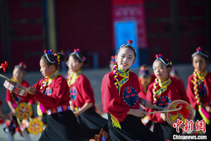 資料圖為西藏自治區(qū)拉薩市城關(guān)區(qū)慈覺林?jǐn)?shù)十名孩子練習(xí)熱巴舞。 記者 貢嘎來(lái)松 攝