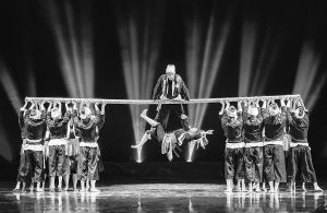 在靜謐的夜空下,首先映入觀眾眼簾的是群舞演員在舞臺中央,用身體構建的人字形“情人房”。房內的瑤族姑娘正在小憩,或許是被屋外的動靜驚醒,她推門出外察看,重重的門軸聲劃破了夜的寂靜,原來是愛慕者正攀在一根竹竿上向自己示愛?!盁o竹不成瑤”,舞蹈伊始,最核心的道具——一根長約8米、杯口粗的竹竿就出現(xiàn)了。借助竹竿,群舞演員通過造型組合及隊形變換,不斷再現(xiàn)生活場景:山坡上、小橋上、屋檐下、窗欞邊……情隨景遷、情景交融,生活圖景和人物情緒巧妙地融合在一起,營造出一種別樣的意境,極大地引發(fā)了觀眾的聯(lián)想。