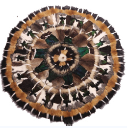 這張拼毯使用了馴鹿、貂熊、紫貂、黃鼬等多種獸皮毛,整體呈放射狀向外延展,構(gòu)圖嵌色五彩斑斕,品質(zhì)十分精美。為了制作這張拼毯,老人花了整整5年時(shí)間收集獸皮。僅野鴨頭頸部的一小塊孔雀綠羽毛,她就收集了近40塊,成為了整塊拼毯的亮點(diǎn)。