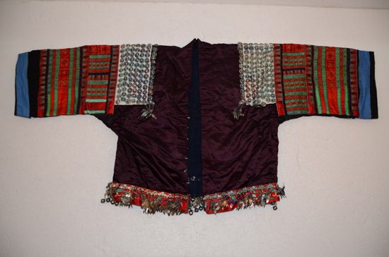 分布在臺江、施秉、鎮(zhèn)遠(yuǎn)三縣交界地一帶苗族村寨,以臺江施洞苗族為代表。該服裝上衣為家織布右衽衣,刺繡主要在前襟、衣領(lǐng)、肩袖部分,以黔東南苗族特有的破線繡為主,所繡圖案主要為龍紋,工藝精美,具有民族特點(diǎn)。