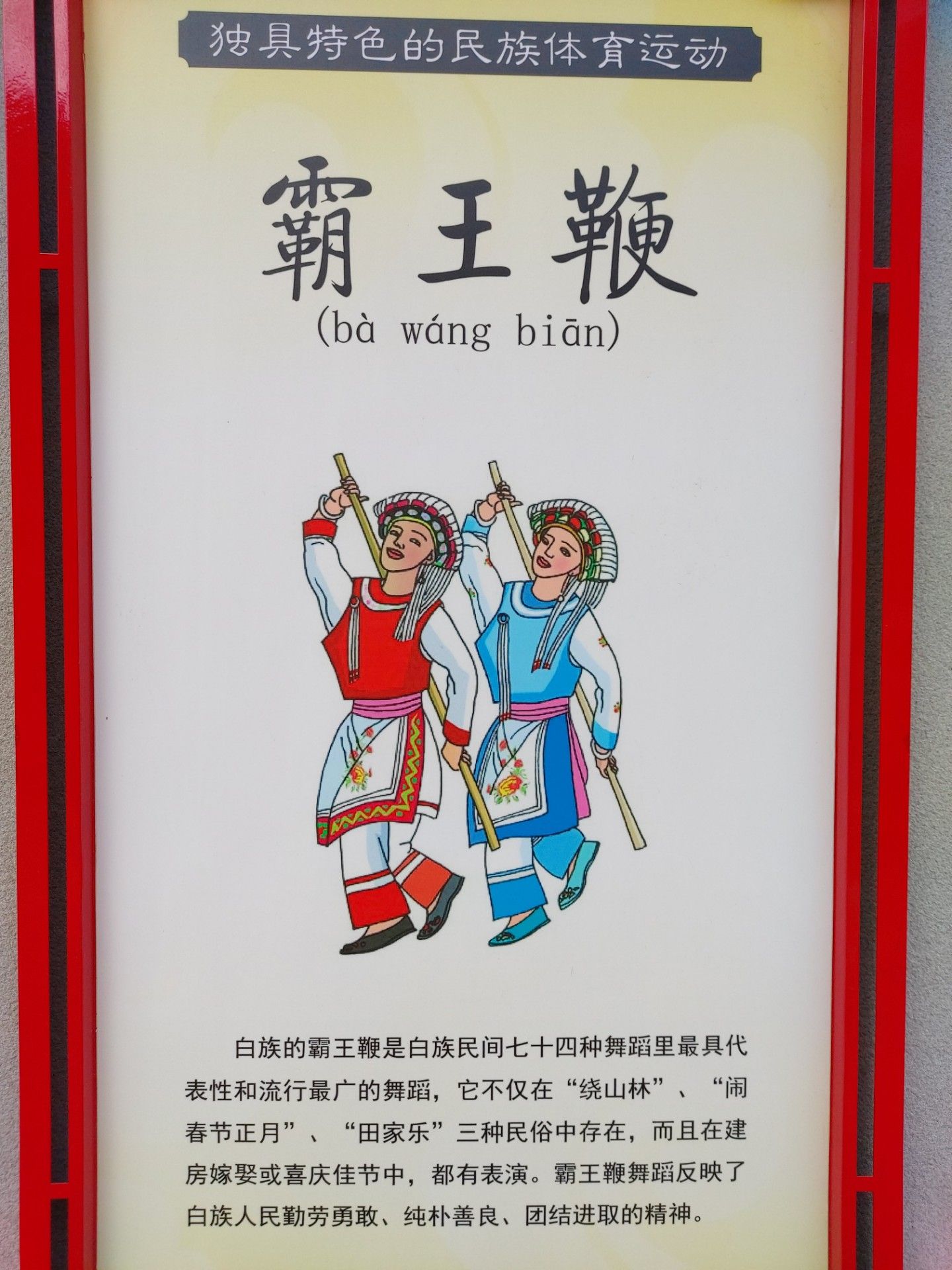 白族的霸王鞭是白族民間七十四種舞蹈里最具代表性和流行最廣的舞蹈,它不僅在“繞山林’”、“鬧春節(jié)正月”、“田家樂” 三種民俗中存在,而且在建房嫁娶或喜慶佳節(jié)中,都有表演。霸王鞭舞蹈反映了白族人民勤勞勇敢、純樸善良、團結進取的精神。