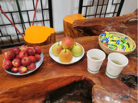 剛踏進傳習所,就見何松康老師已準備好茶水以及時下最新鮮的花紅、梨子等水果候著我們到來了。對于每一位來到傳習所了解白族霸王鞭文化的訪客,她都熱忱相待。