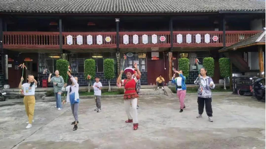 作為傳習所的負責人,何松康不僅在傳習所里教大家霸王鞭,一有空她就帶上霸王鞭,穿上傳統(tǒng)的勞作服飾走出去,給更多的人教學(xué)。