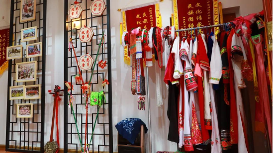方正的堂屋里掛滿了何松康參加演出、培訓(xùn)的各種照片及霸王鞭、八角鼓、服裝等演出道具。院子的墻上專門請人繪了一幅霸王鞭的彩繪,旁邊書寫:“弘揚白族傳統(tǒng)文化,傳承民間舞蹈藝術(shù)”。