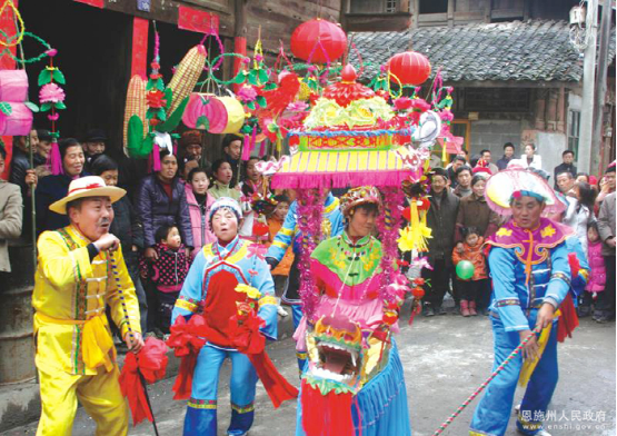 利川燈歌,又名燈調(diào),始于清代初期,已有300多年的歷史,是人們逢年過(guò)節(jié)之時(shí)以彩龍船為道具,畫(huà)地為臺(tái)、亦唱亦演的民間藝術(shù)形式。2011年5月,利川燈歌被國(guó)務(wù)院公布為第三批國(guó)家級(jí)非物質(zhì)文化遺產(chǎn)名錄。