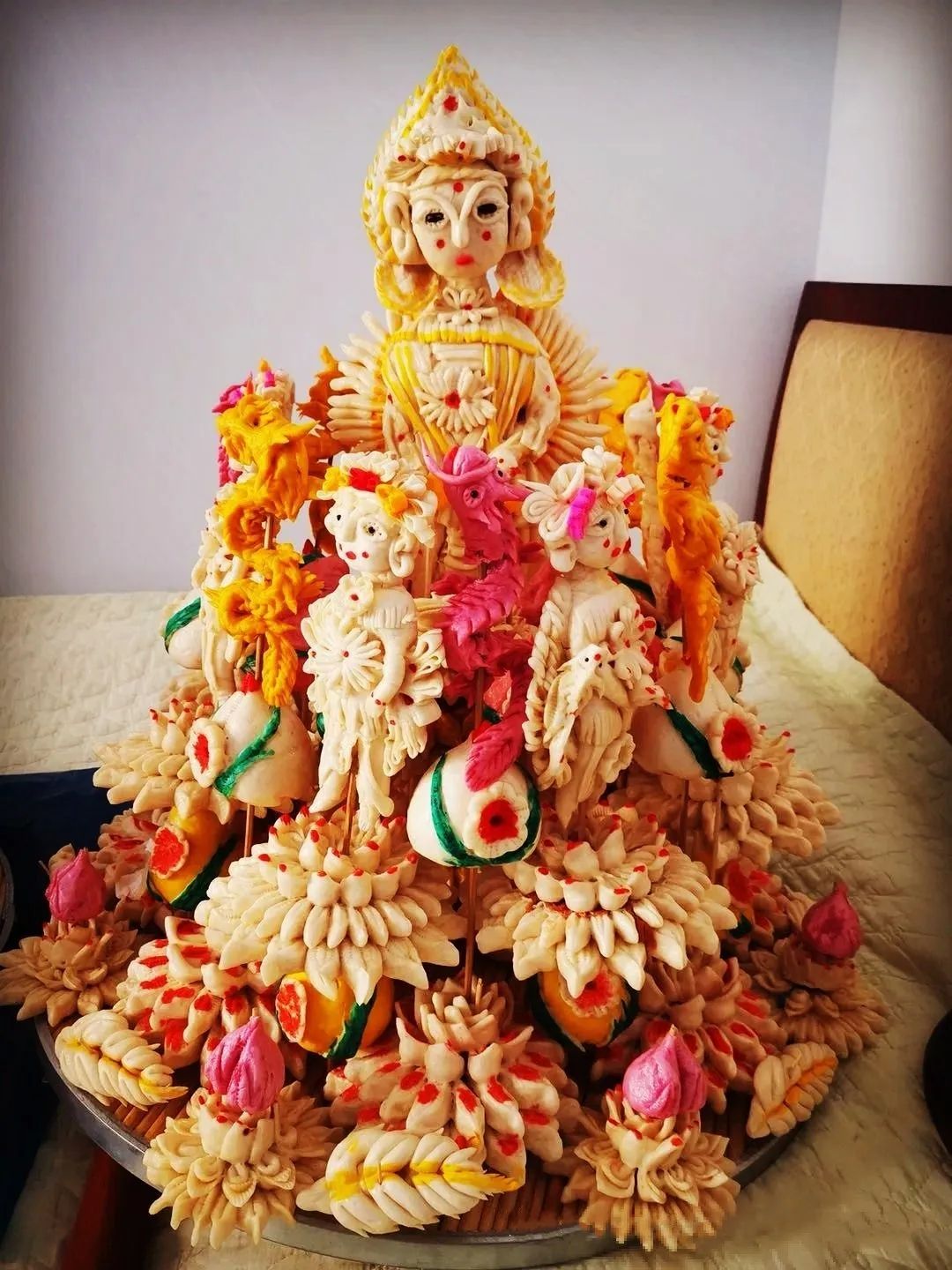 面塑,俗稱捏面人。在呼和浩特市托克托縣地區(qū)最早就用面粉為主料,用手和簡單的工具捏出各種造型的面制品,然后上籠蒸熟,常用來祭祀、供奉先人、送人和人生儀禮。托克托縣地區(qū)面塑制品主要有面人、棗山山、寒燕燕、面鎖等。