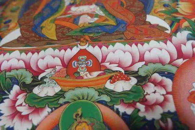 900多年前流傳于衛(wèi)藏地區(qū)(現(xiàn)山南)的齊烏崗派唐卡,由雅堆·齊烏崗巴創(chuàng)立,與嘎瑪嘎赤畫派、勉塘畫派、欽孜畫派、埃赤畫派并稱“唐卡五大畫派”。齊烏崗派特點(diǎn)為人物體形飽滿、生動細(xì)膩,色彩以棗紅、橘紅暖色系為主;中央的主尊突出,背景多用卷草紋作為裝飾。特別是,齊烏崗派唐卡的佛像肩膀旁都有象征翅膀的“三角”,源于創(chuàng)始人齊烏崗巴行動靈敏,亦被稱作“齊烏派”。
