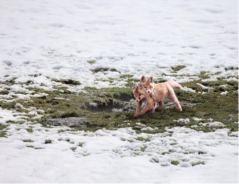 時(shí)至中午,幾個(gè)小家伙變得急躁起來(lái)。它們向著爸爸媽媽捕食回來(lái)的方向,一溜兒排開(kāi),蹲在洞門前,眼神中充滿期盼……這時(shí),空中的紅嘴鴨俯沖下來(lái),嚇得小赤狐們趕緊竄進(jìn)洞中。