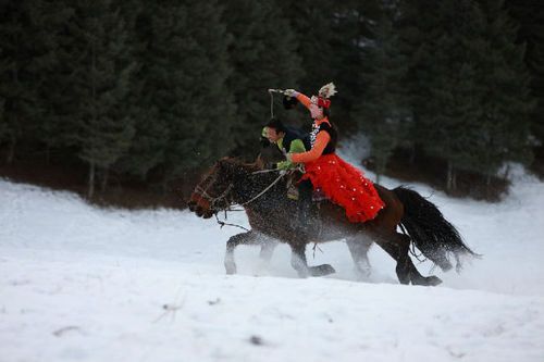 這一來,賽場(chǎng)的氣氛就更加高漲了,那兩位大叔大嬸詼諧的 表演惹得人們大笑到捂住肚子“唉呀”的叫喚。這真是:哈薩克風(fēng)俗實(shí)在怪,鞭子底下談戀愛!